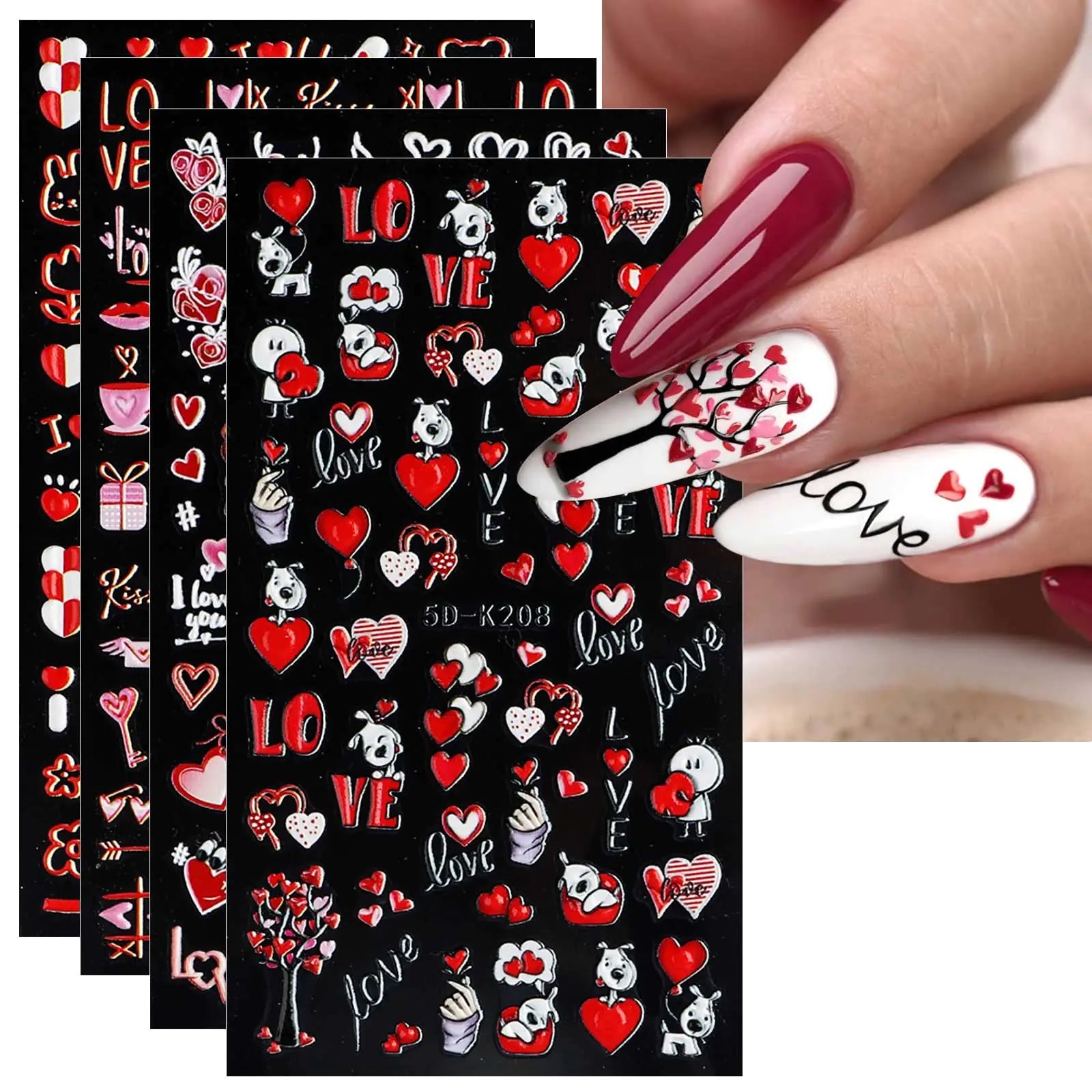 JMEOWIO 3D Embossed Valentines Day Nail Art Stickers Decals Self-Adhesive Pegatinas Uñas 5D Heart Love Nail Supplies Nail Art Design Decoration Accessories 4 Sheets