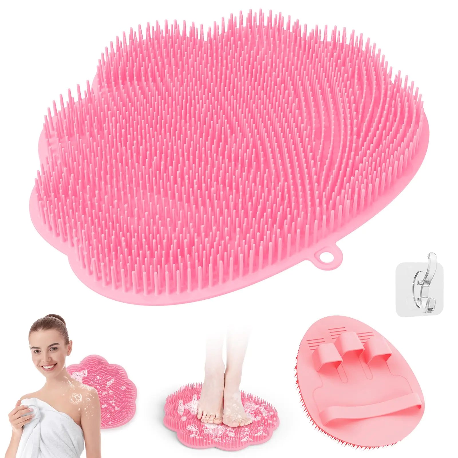Manmihealth Upgrade Shower Foot Massager Scrubber & Bath Glove Set(2 PCS) Hands-Free Back Scrubber for Shower Wall-Mounted Shower Brush with Body & Face Scrubber and Free Adhesive Hook. (Pink)